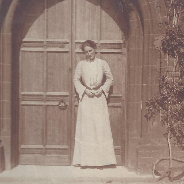 Right: Gwendolen Crewdson standing in front of the original College entrance taken by Dorothy Marshall, 1905 (archive reference: GCPH 10/24/22). Gwendolen Crewdson (1872–1913) was a student at Girton 1894–1898, College Librarian and Registrar 1900–1902, Junior Bursar 1902–1905.  Dorothy Marshall (1868–1966) was Girton Resident Lecturer in Chemistry 1897–1906.