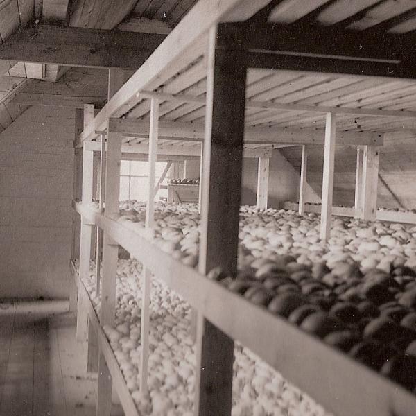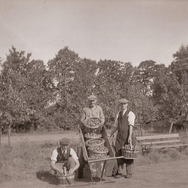 (Left) Three gardeners stand in the Orchard with a handcart and holding basketfuls of fruit (archive reference: GCPH 10/20/33). (Right) The apple harvest stored on wooden shelves in the Autumn of 1937. David Whitehead, former Head Groundsman at Girton, identified the location as the top floor of Grange Cottage (archive reference: 10/20/36).
