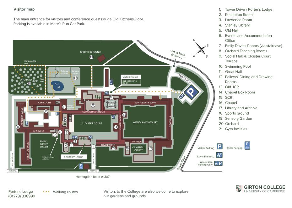 There is free and ample parking in our Visitors Car Park called Mare’s Run, it is accessible off Girton Road. If you require disable parking, please contact our Porters’ Lodge.
